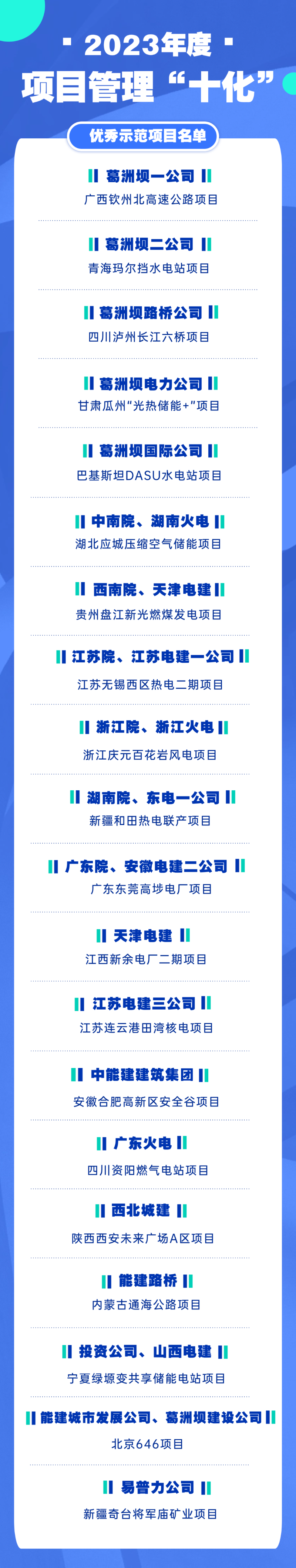 news工程項目是企業(yè)發(fā)展的命脈,是價(jià)值創(chuàng )造的源泉,是品牌提升的“硬公關(guān)”。2023 年,中國能建以“項目履約提升年”專(zhuān)項行動(dòng)為契機,全級次狠抓項目管理“十化”落地,深入開(kāi)展優(yōu)秀示范項目的創(chuàng )建工作,持續推動(dòng)項目管理向科學(xué)化、數字化轉變。為表彰先進(jìn)、樹(shù)立典型,經(jīng)所屬企業(yè)推薦、公司組織評選,決定授予20個(gè)項目“2023年度項目管理‘十化’優(yōu)秀示范項目”榮譽(yù)稱(chēng)號。
